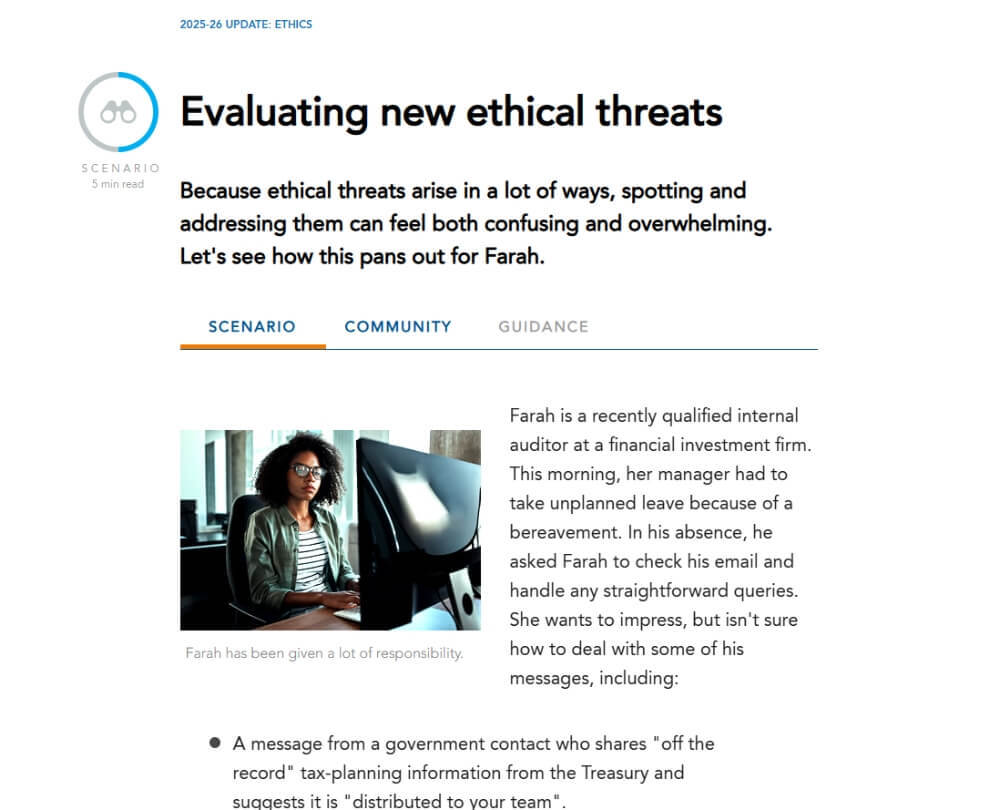 This course considers the current challenges to our professional ethics, and how you can best deal with them. You’ll explore the IESBA Code and other relevant ethical guidance, and examine how updates, jurisdictional differences and recent developments – particularly in AI, ESG and cybersecurity – are shaping new ethical risks. The course also includes real-world case studies that illustrate the root causes and consequences of unethical behaviour in action.
