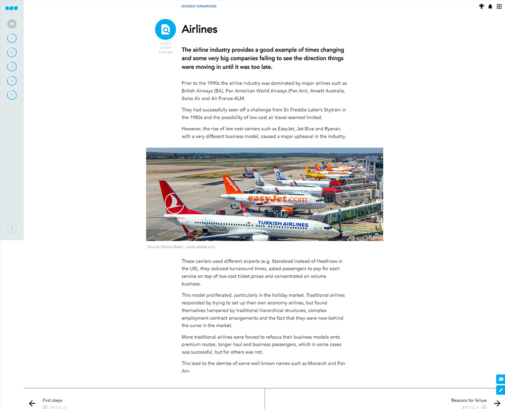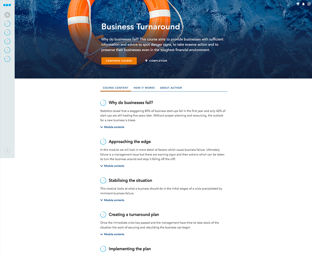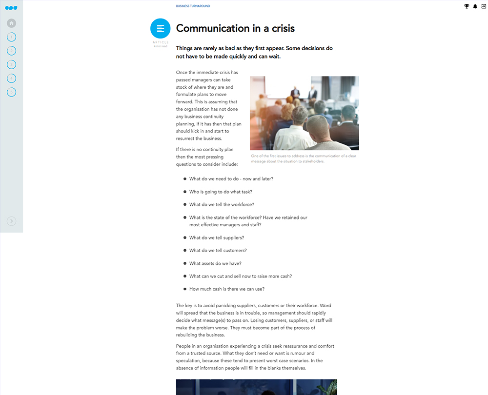 This course provides information and advice on business turnaround, which can help businesses prepare for potential issues and have the best hope of survival. It will enable you to identify the common warning signs that there’s trouble ahead. Discover what steps you need to take at different stages of a crisis as well as the key aspects that you need to consider when developing and implementing an effective business turnaround.