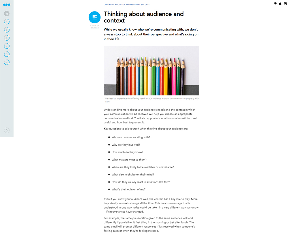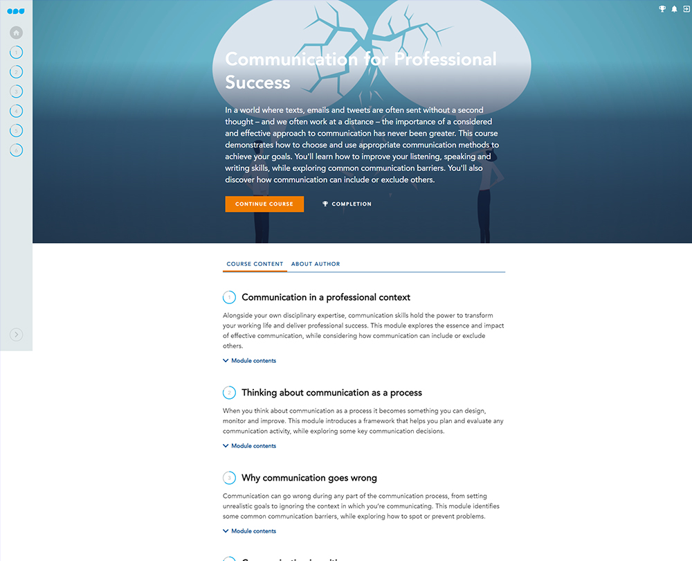 You’ll come away with a clearer understanding of how communication works in professional settings and how to approach it more deliberately. This course will give you practical techniques to communicate more effectively with colleagues, clients, and stakeholders, helping you strengthen relationships, support decision-making, and build greater confidence in your professional role.