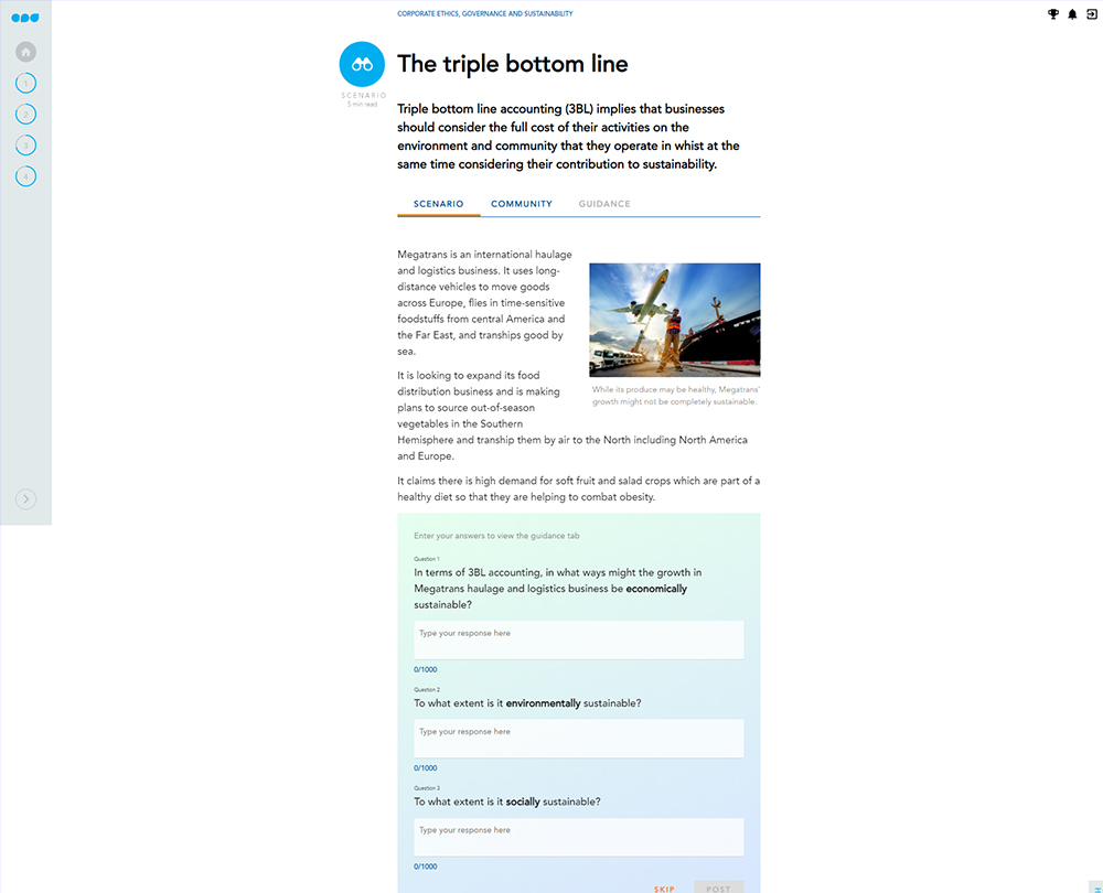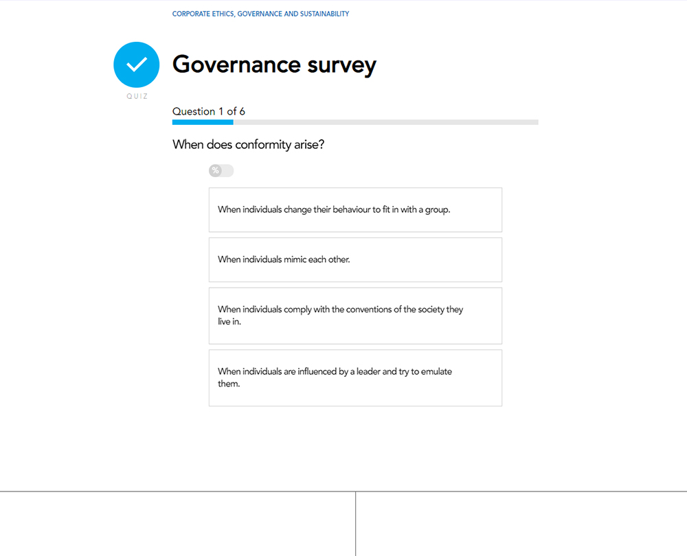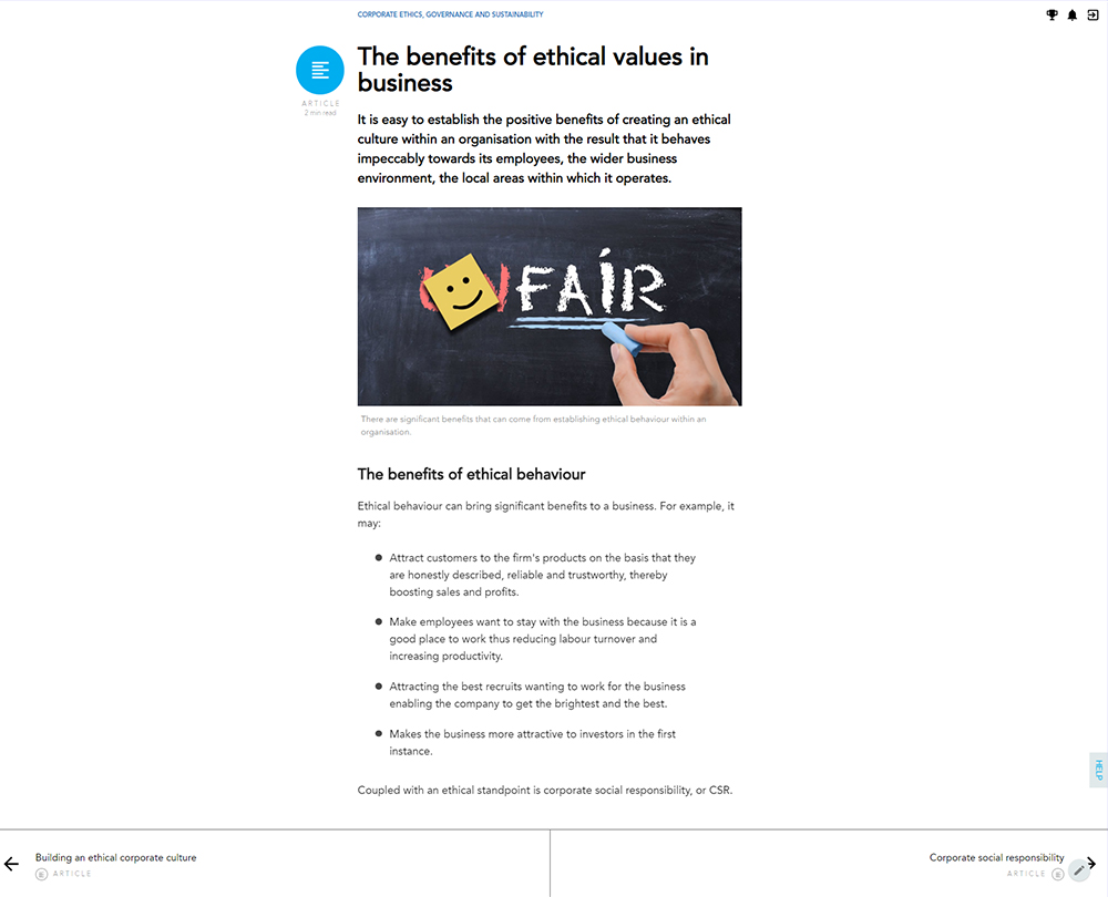 This course provides insight into the key principles, systems and processes that will enhance your organisation’s ethical behaviour and promote sustainability. It will enable your organisation to make ethical and sustainable decisions that fully consider the consequences for your organisation as well as stakeholders and the wider environment.