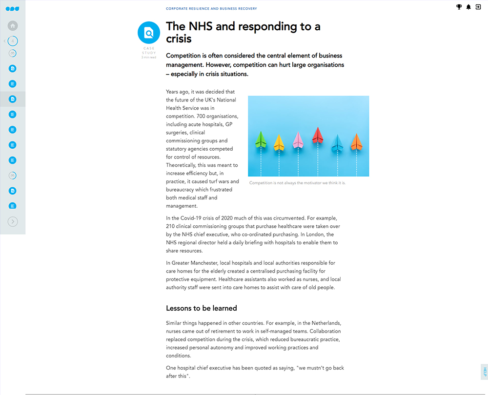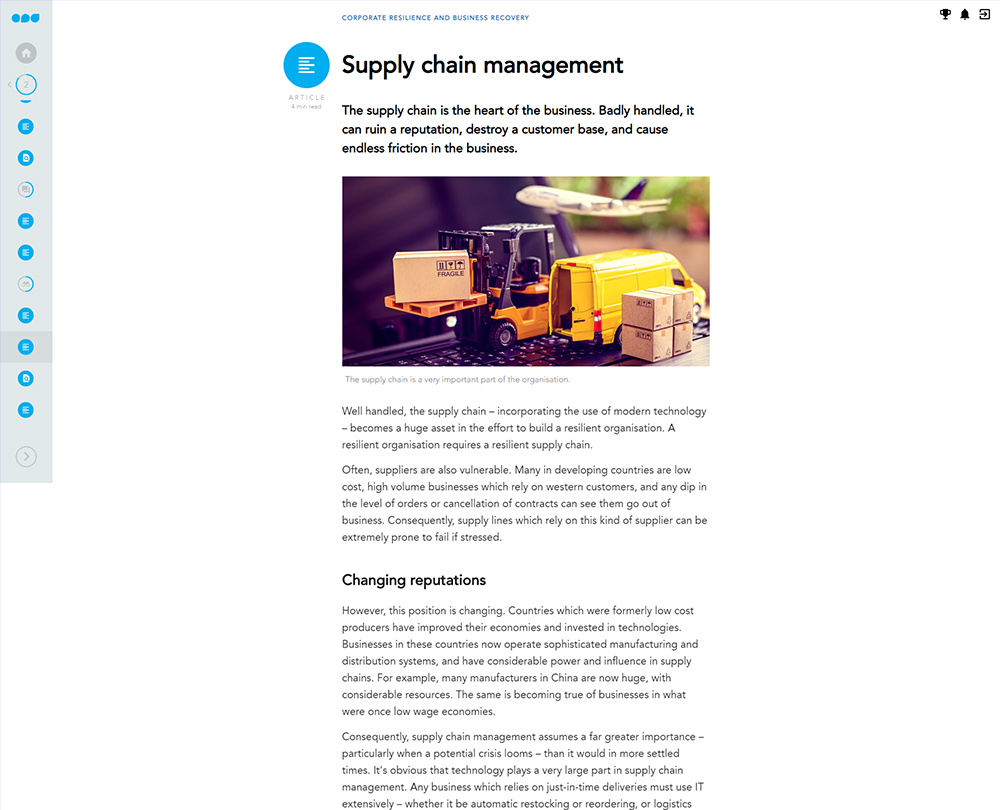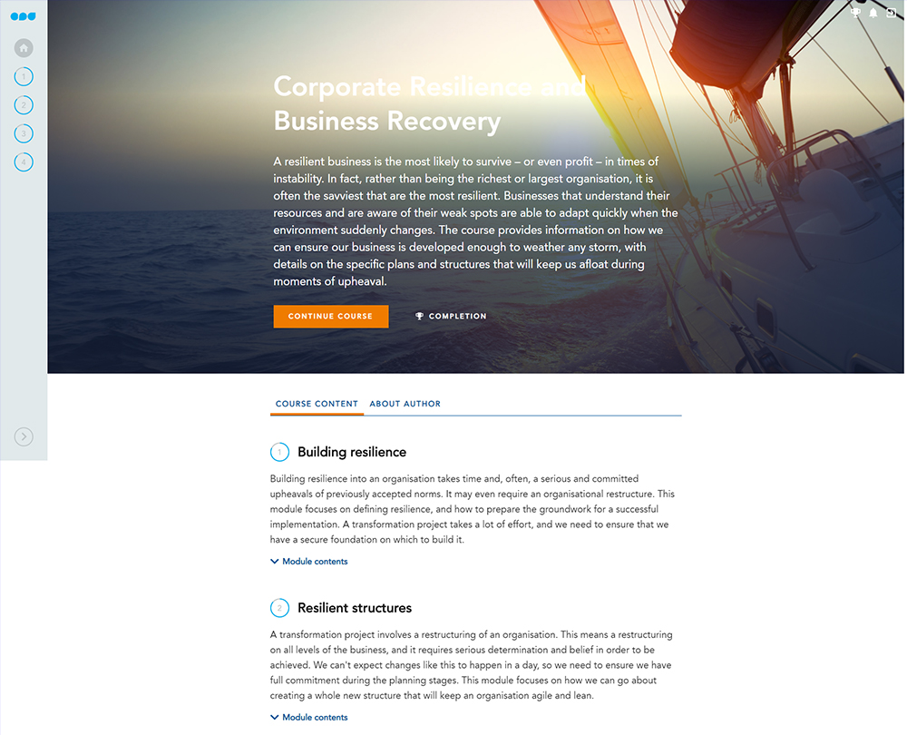 This course guides you through how to build resilience within your organisation. It discusses the structures needed to create an agile and lean organisation, and how this helps business management when facing a crisis. You’ll also discover what good management looks like during the recovery period, and how a crisis provides the opportunity to build resilience.