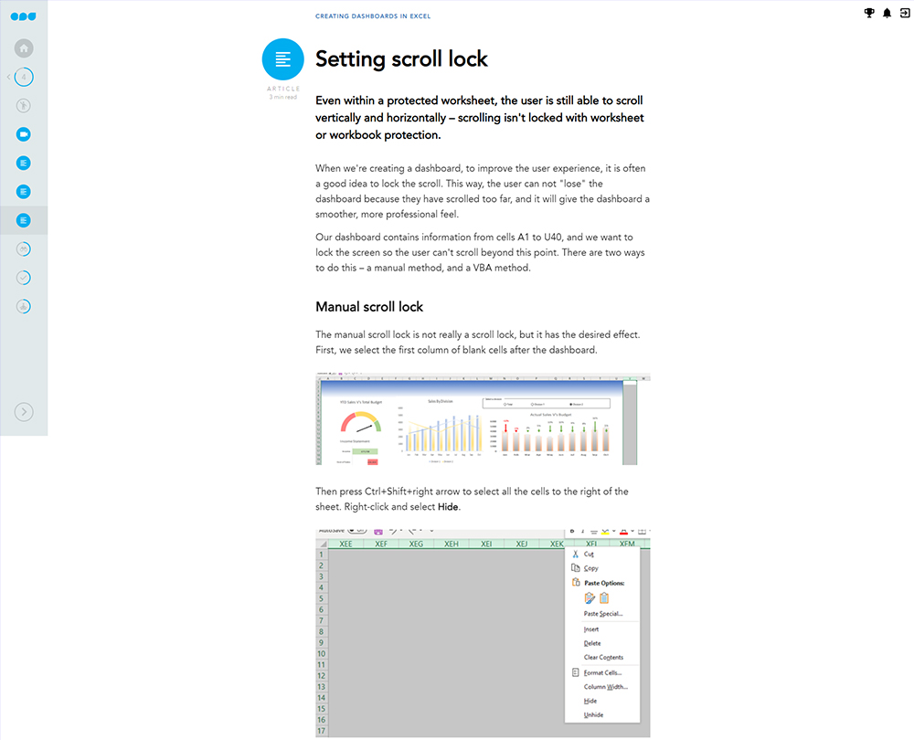 • Hide sheets, use scroll lock and protect your dashboards