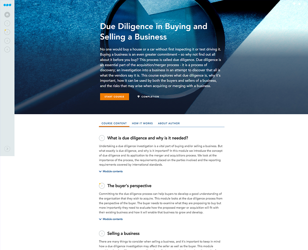 This course explores the process of due diligence from both the buyer and the seller’s perspective. You will learn the importance of due diligence for both parties and will consider the risks involved in buying or selling a business, and what you can do to minimise these.