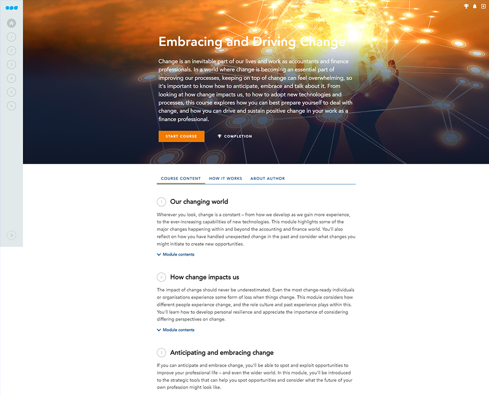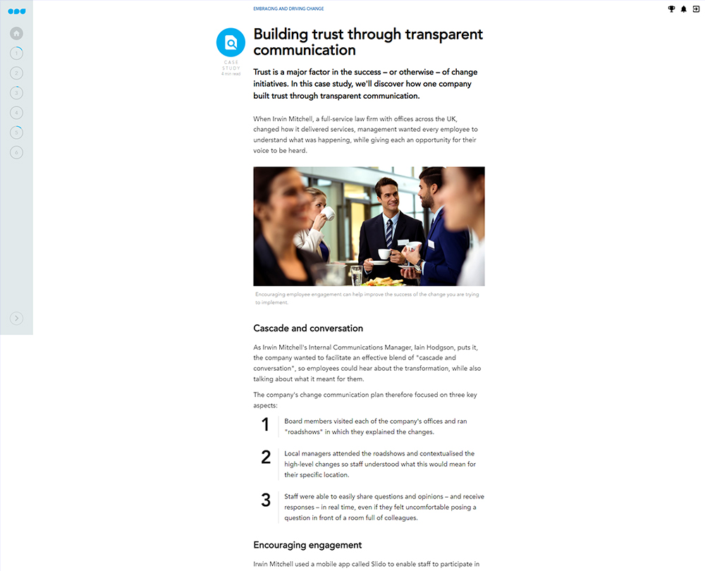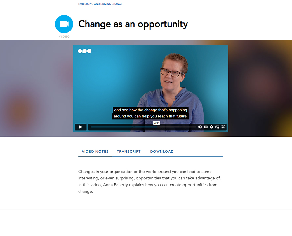 From looking at how change impacts us, to how to adopt new technologies and processes, this course explores how you can recognise change as an opportunity for business and personal growth. With the right changes, productivity and efficiency will increase, and it can be used as a strategic tool to help you exploit those opportunities and consider what the future of your own profession might look like. Discover how to celebrate change, how adopting an agile work culture can be beneficial and how to select the most appropriate communication messages to use.