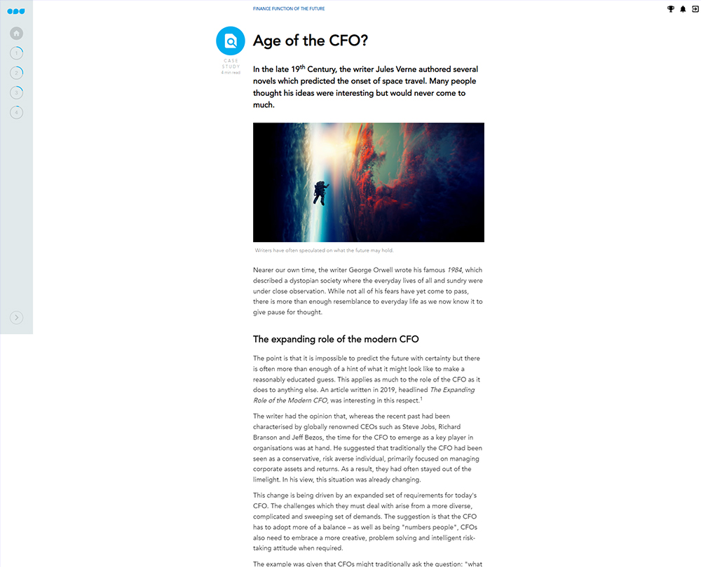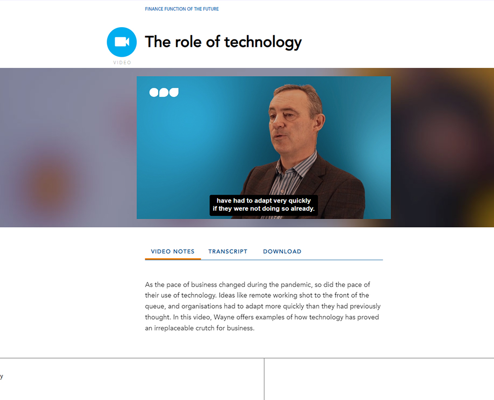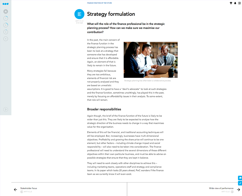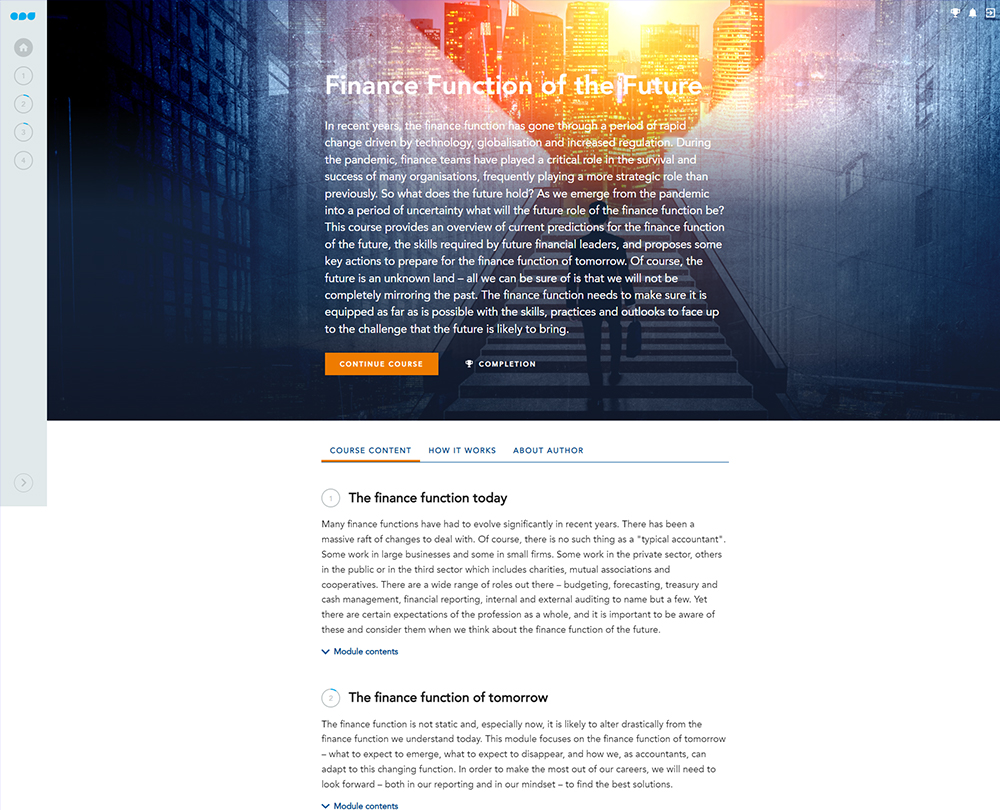 This course delves into the predicted trends and changes in the finance function. It considers the strategic, forward-looking role played by finance professionals during the pandemic, and the impact of that on the future for accountants. The course will help you to plan for the challenges of the future by focusing on the skills, practices and outlooks that will be necessary to create the finance function of the future.