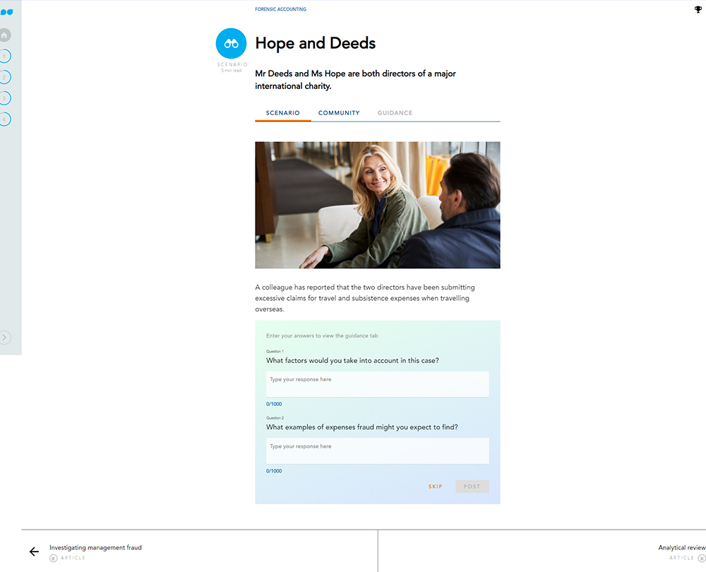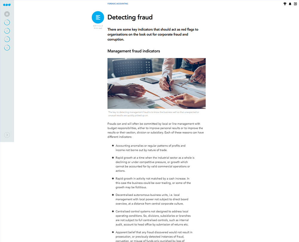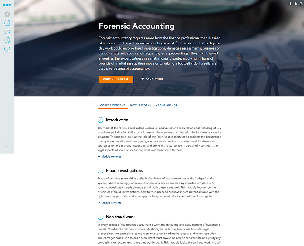 This course introduces you to forensic accounting by giving you a level of knowledge and skill that will enable you to understand more about this role, identify fraud and plan appropriate investigations.
