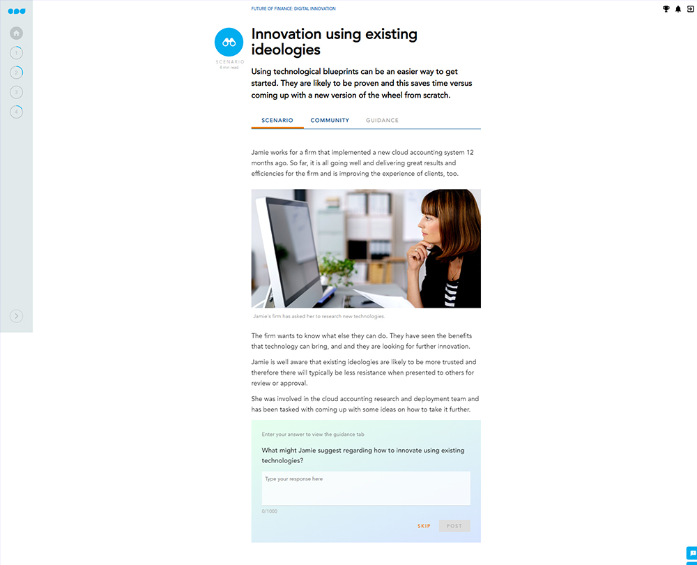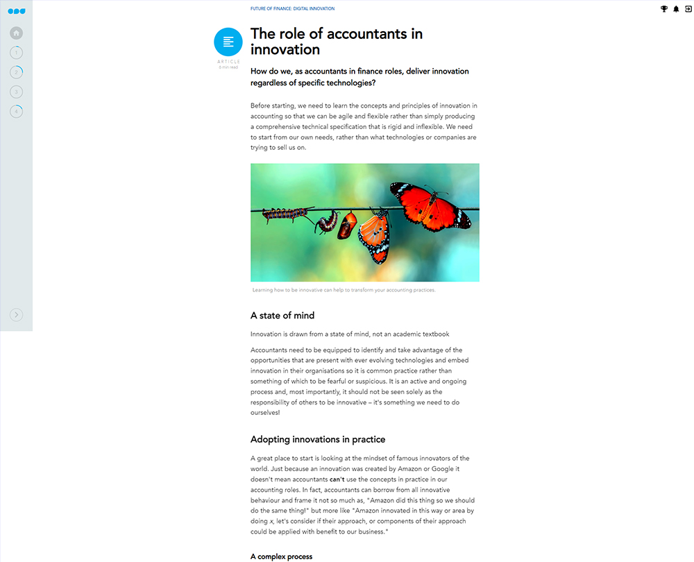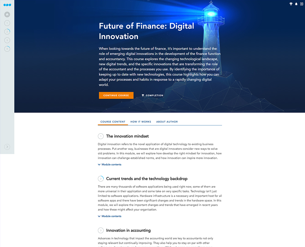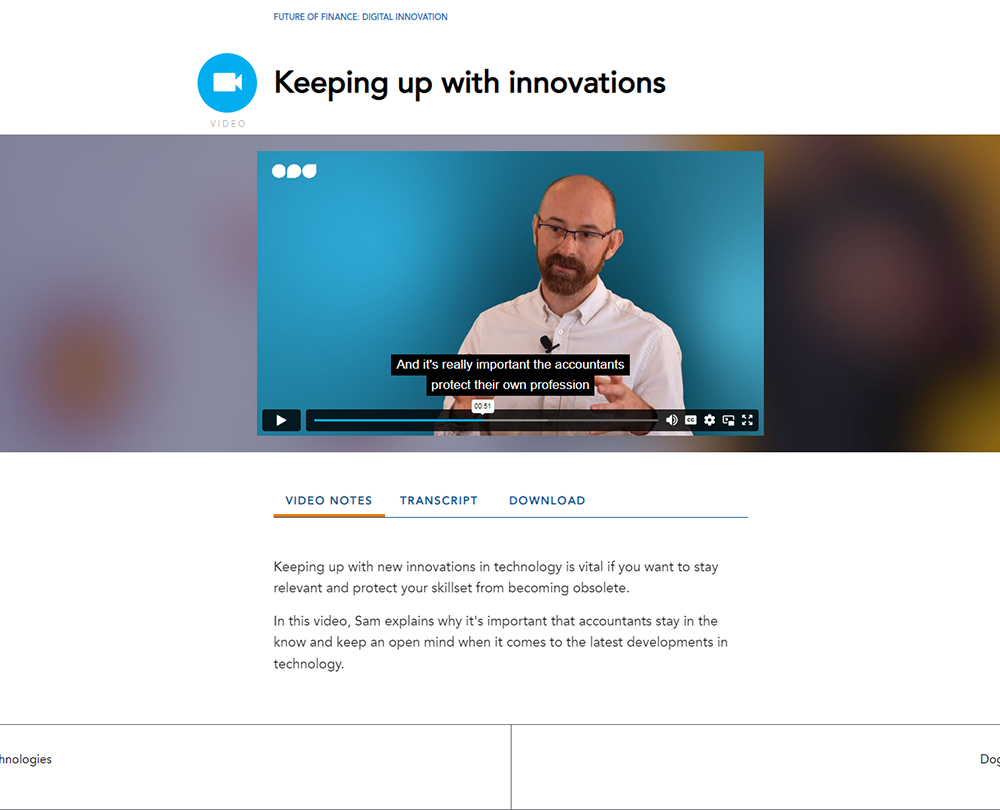 By breaking down innovation and change into component parts, this course explores the accounting-specific innovations that you need to know about and how you can use these to improve your practice. Explore how accountants can develop the right mindset for innovation and how it can challenge established norms; by identifying the importance of keeping up to date with new technologies. This course highlights how you can adapt your processes and habits in response to a rapidly changing digital world.