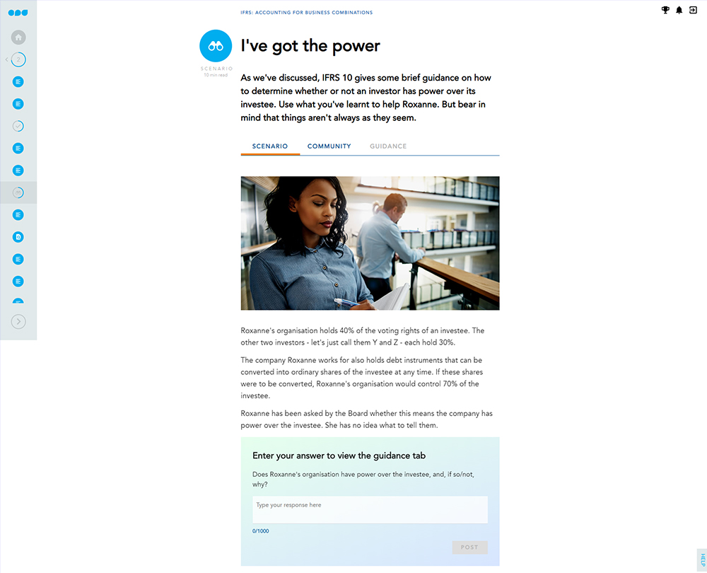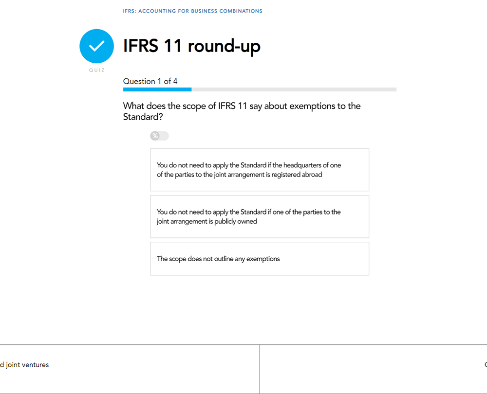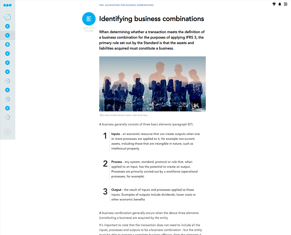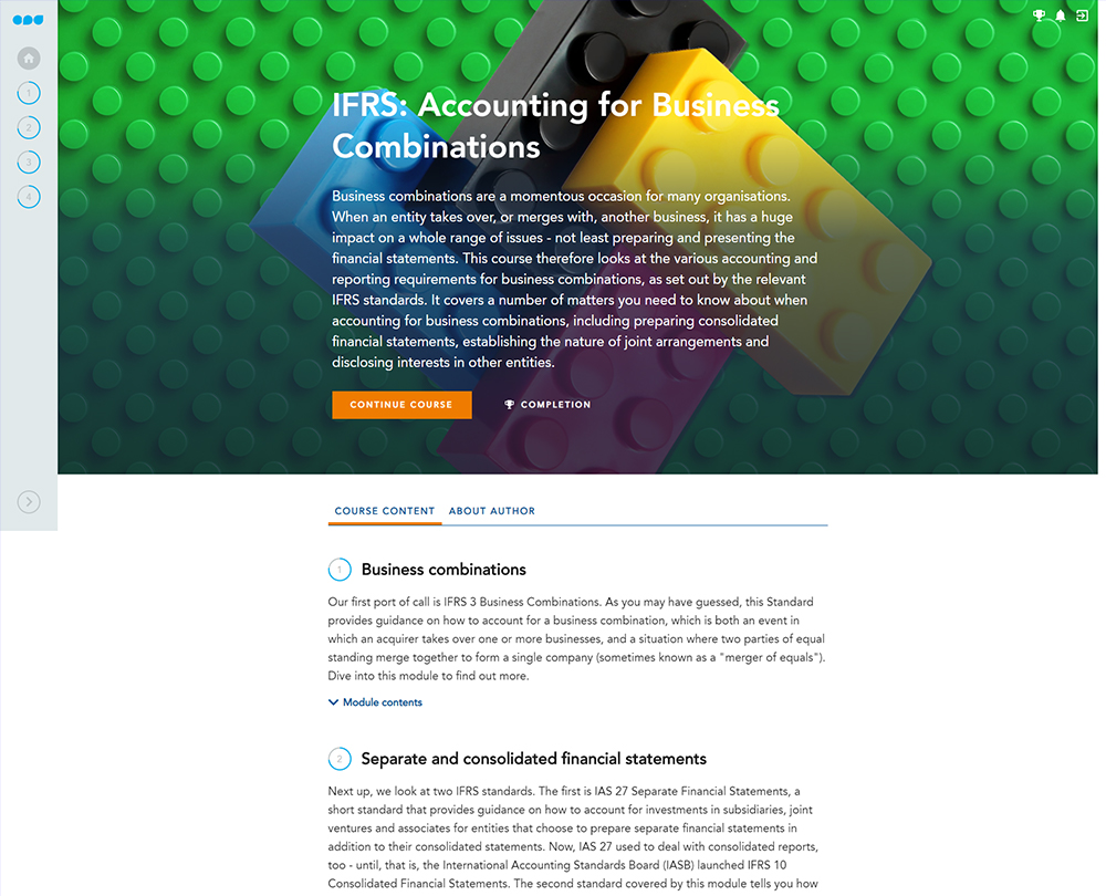 This course looks at the various implications of accounting for such issues which are covered by a number of IFRS Standards such as business combinations, separate financial statements and disclosures of interests in other entities.