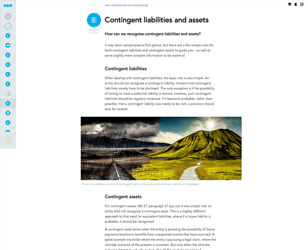 This course will guide you through the International Financial Reporting Standards (IFRSs) related to expenditure. You’ll learn about the pitfalls involved in making judgements concerning provisions and contingencies under IAS 37, make sound decisions when dealing with employee benefits and retirement benefit plans, whether under IAS 19 or IAS 26, and be confident about your decisions in the high risk areas of accounting for taxation on income under IAS 12.