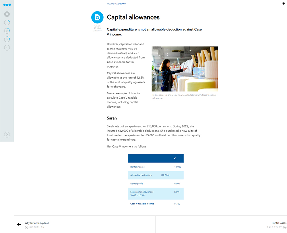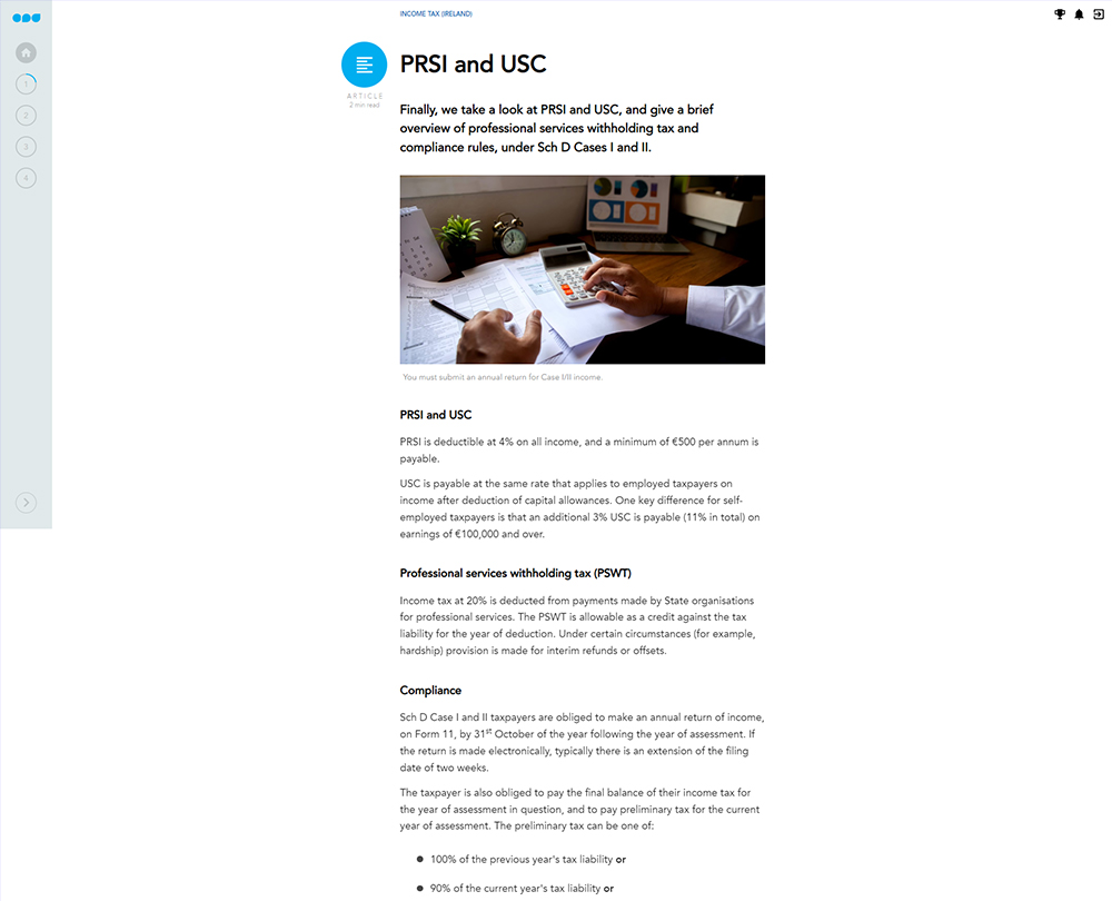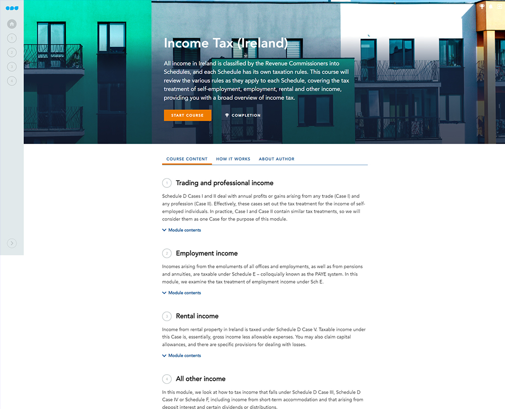 This course takes you through the various tax requirements under each Schedule/Case, giving you an overview of the income tax system in Ireland. Make sure you are up to date on how to tax various income types, including self-employment, trading and professional, and rental.