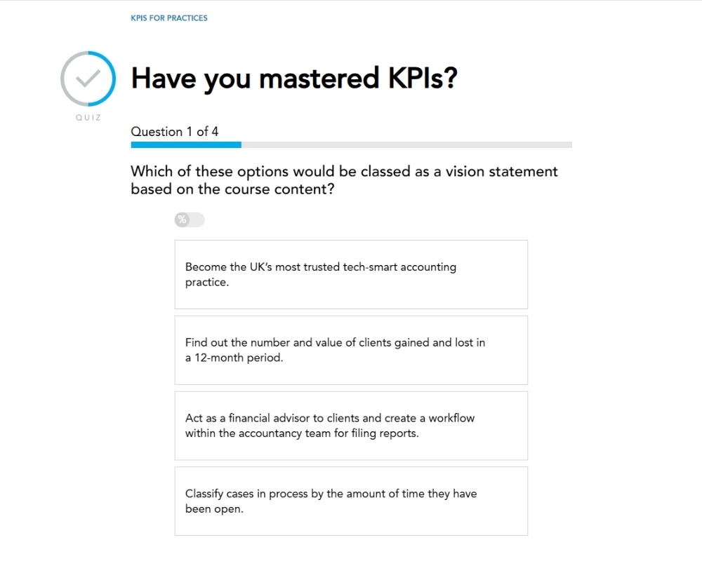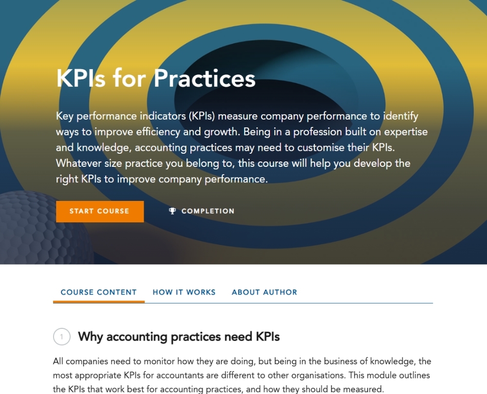Accountancy is a profession based on expertise and knowledge, so developing key performance indicators (KPIs) for a practice requires a particular approach. Whatever the size of your practice, this course will help you develop the right KPIs to improve performance.