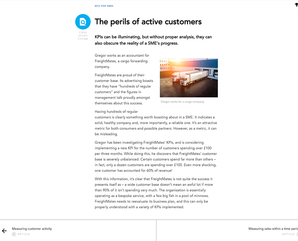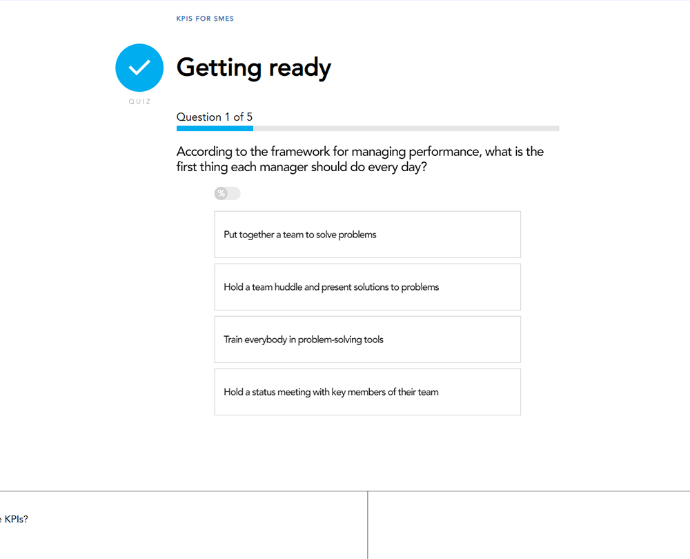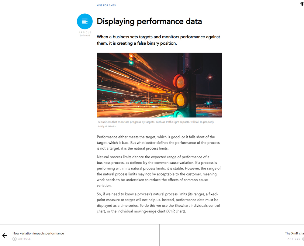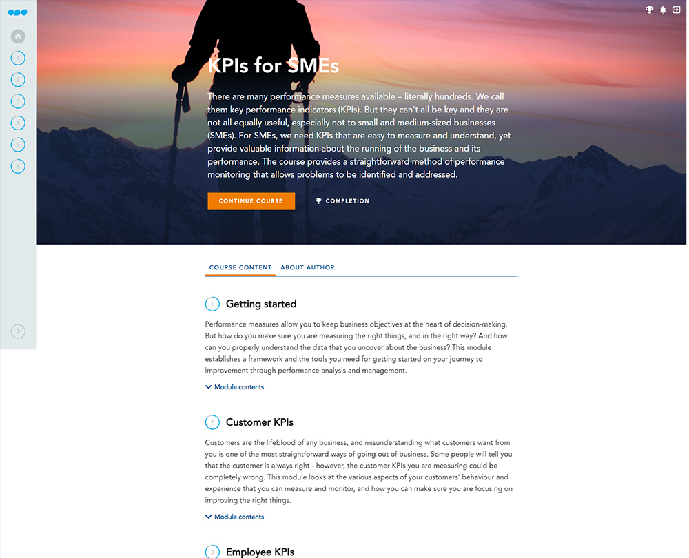 Recently updated to include extra content on how to use KPIs as part of a continuous improvement process, this course is about performance measures that work for micro, small and medium-sized enterprises (SMEs). The course provides a straightforward method of performance monitoring that allows problems to be identified and addressed.