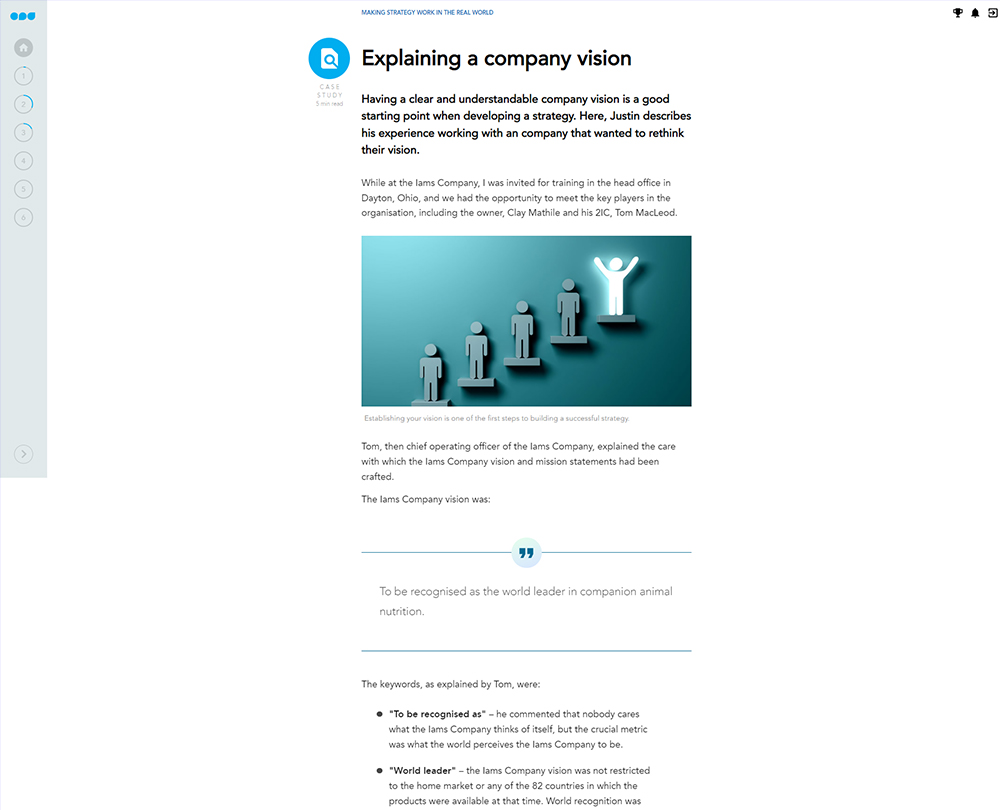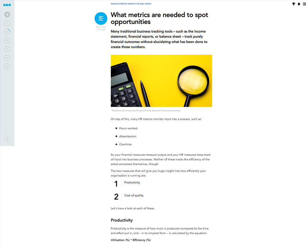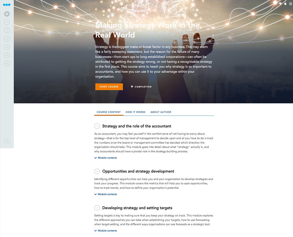 This course will teach you what it means for a business to have a strategy, and how as a finance professional you can play an active part in forming, implementing and monitoring the success of that strategy over time. You will learn how to analyse trends; set targets and what tactics you can use to ensure your strategies are successful.
