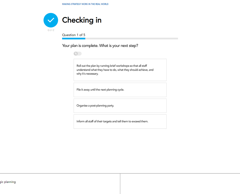 This course teaches what it means to have a strategy, and how you can play a part in forming, implementing and monitoring a strategy in your organisation. Learn to analyse trends; set targets and what tactics you can use for successful strategies.