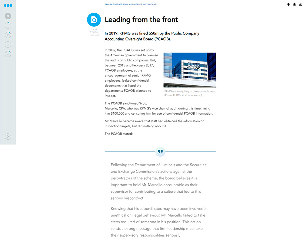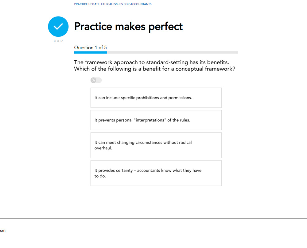 This course considers such ethical grey areas and provides accountants in practice with the practical, day-to-day approaches they need to avoid making unsafe decisions. You will employ codes of professional conduct to fulfil your role, including when providing advice on taxation matters. You’ll gain an understanding of the role of ethics in the workplace and how to establish an ethical culture in your practice.