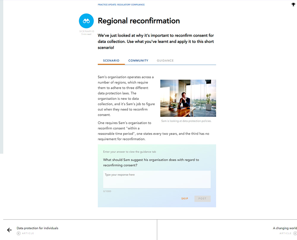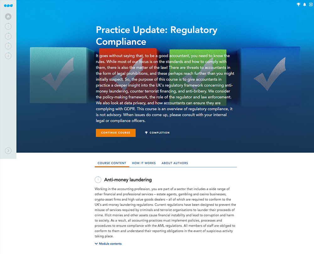 This course looks at each of these areas and, by considering the policy-making framework, the role of the regulator and law enforcement, helps you protect your practice and your clients. The course is an overview of regulatory compliance, it is not advisory. It also covers data protection regulations concerning how you remain compliant when managing and collecting data.