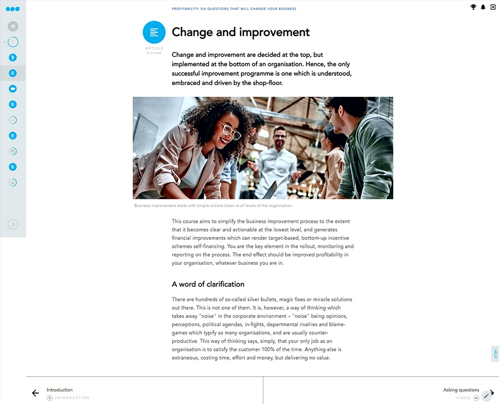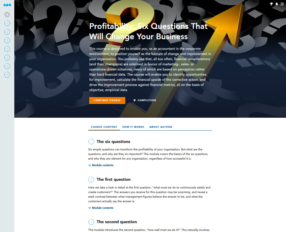 This course will guide you through six simple questions that can transform the profitability of your organisation. You’ll discover the important roles that customers, targets, measurement processes and costs play in the improvement of your organisation. The course will enable you to drive the improvement process based on objective, empirical data.